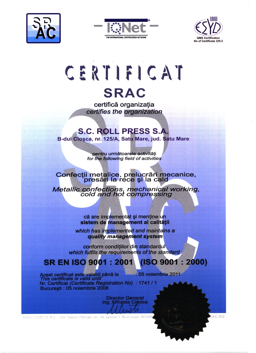 Sistemul de management al calităţii este certificat ISO 9001:2001.